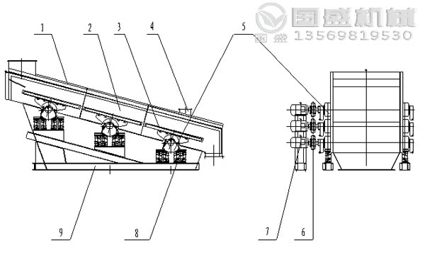 產(chǎn)品結(jié)構(gòu) ![]() 1.密封罩 2.篩箱 3.篩板 4.除塵口 5.激振器 6.軟連接裝置 7.電動機 8.減振彈簧 9.底托